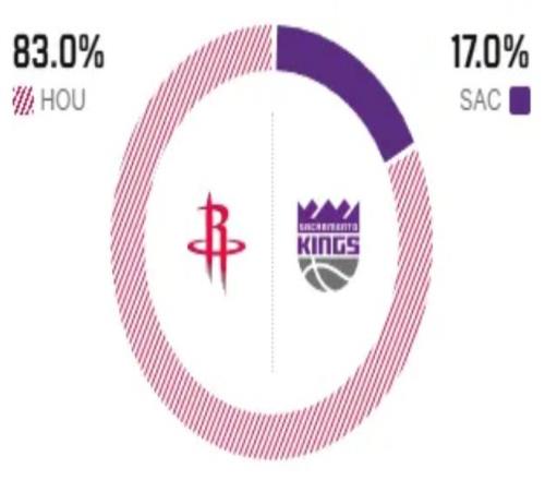 赛前,美媒ESPN对本场比赛进行了胜率预测,火箭队胜率依旧高达83%,占据绝对上风,国王队胜率则仅有可怜的17% ,还是不被看好。